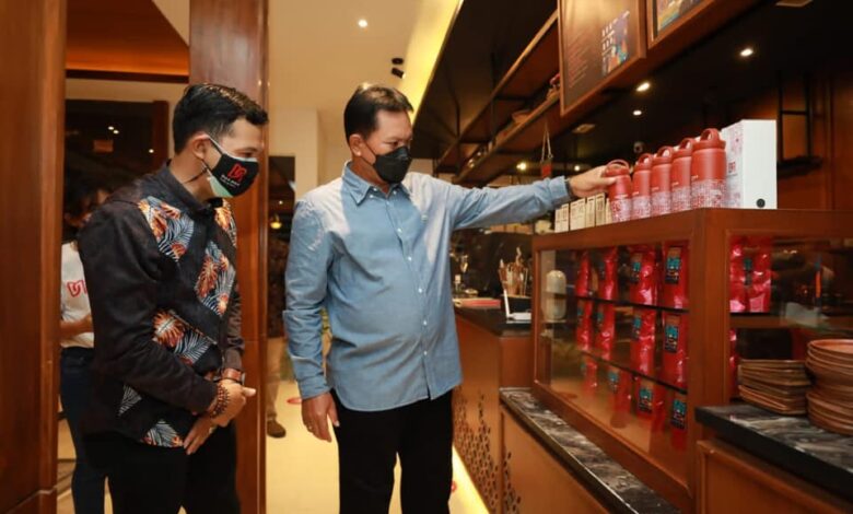 Wali Kota Madiun Maidi yang hadir saat grand opening memberikan apresiasi kepada F Bagus Panuntun, owner Dot Max Coffe tersebut.