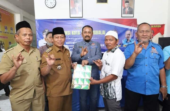 Walikota Waris didampingi Kepala Dinas Perikanan Muslim dan Ketua DPC HNSI H Syafrizal (Budi) menyerahkan kartu secara simbolis.
