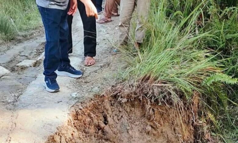 Pipa tersebut berada di tepi jalan penghubung desa, sementara jalan tersebut hampir putus karena longsor.