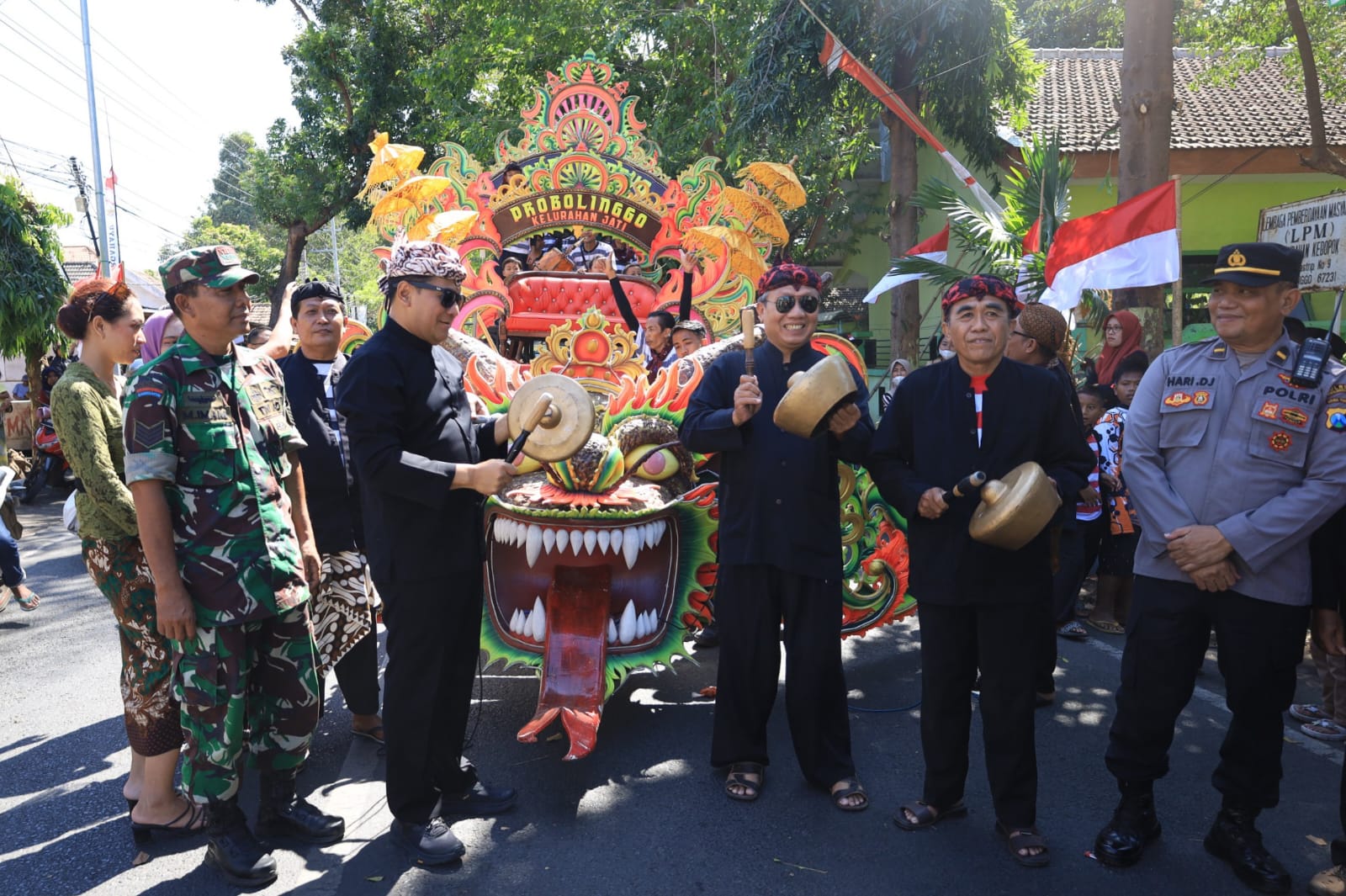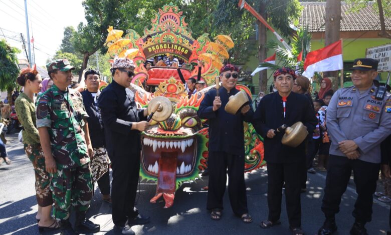 BeritaNasional.ID, PROBOLINGGO JATIM– Pj. Wali Kota Nurkholis mengikuti kirab budaya dengan menaiki kereta Kelabang Songo, yaitu sebuah kelompok seni musik duk-duk atau doul pada pagelaran Seni Budaya dan Pariwisata, Manggahi Nyadran Buddayah Leluhur di Kelurahan Kedopok pada Minggu. Senin (5/8/24).