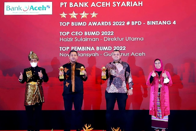 Bank Aceh berhasil menyabet penghargaan di dua kategori yakni, Top Award BUMD kepada PT Bank Aceh Syariah, dan Best CEO BUMD kepada Direktur Utama Bank Aceh, Haizir Sulaiman. Sementara itu, dalam kesempatan yang sama, Gubernur Aceh, Nova Iriansyah juga turut memperoleh penghargaan sebagai Top Pembina BUMD Award 2022.